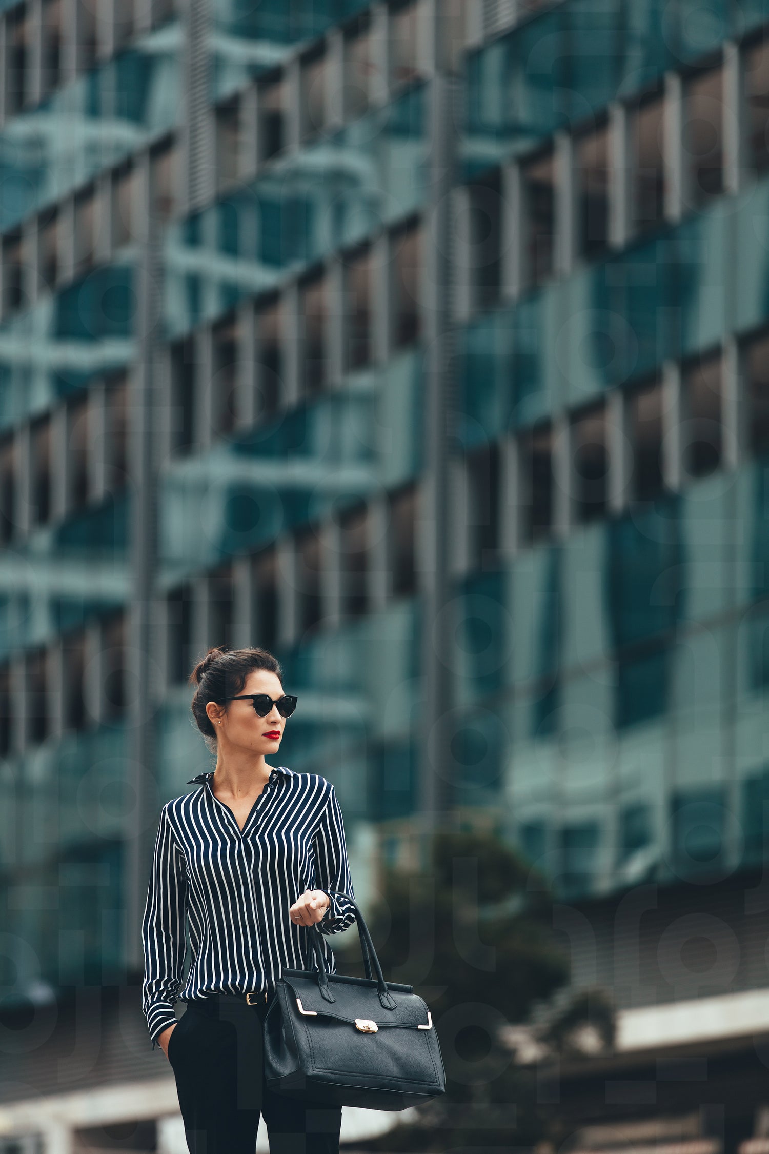 Asian female business professional outside an office building. Businesswoman with handbag on the city street.