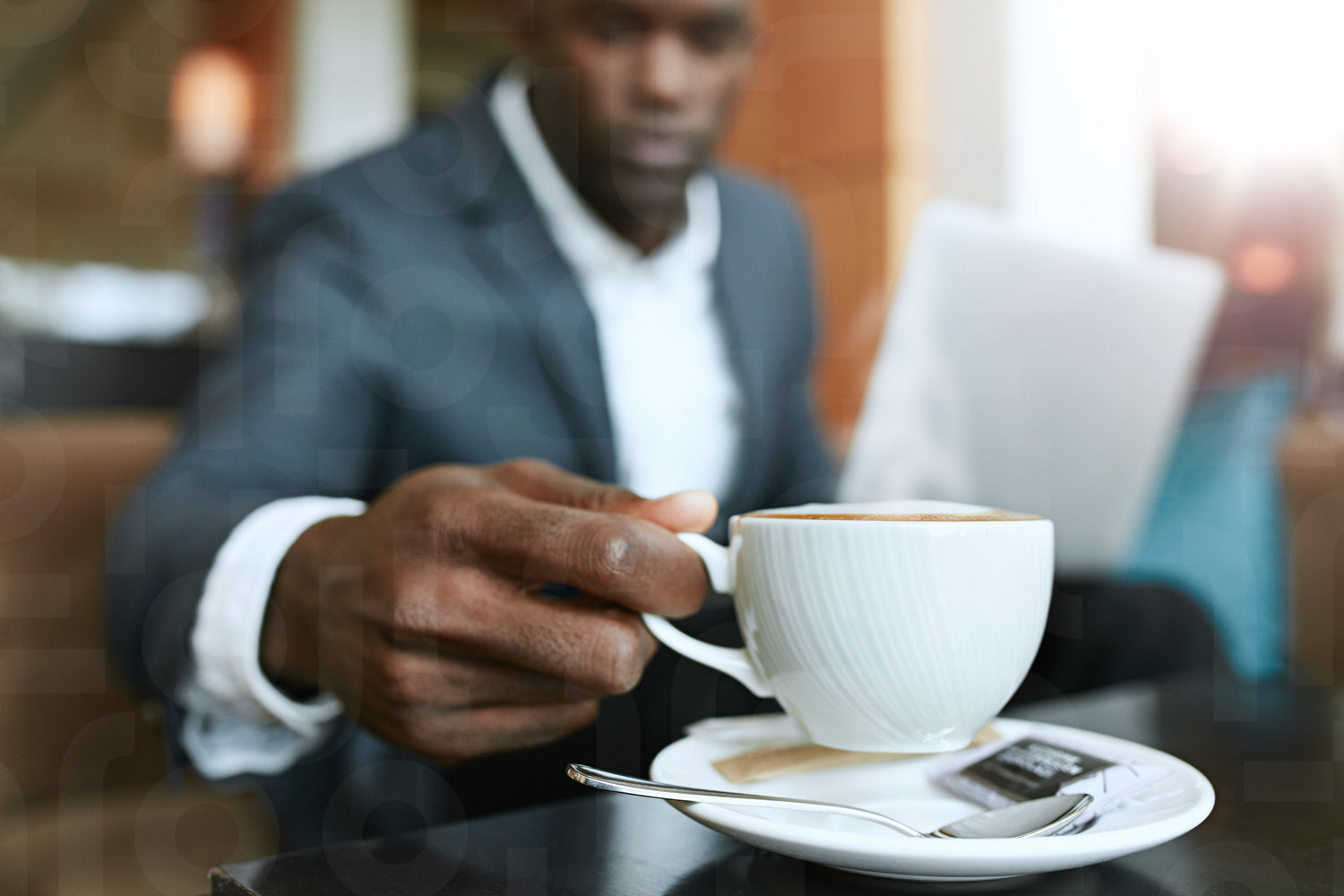 Close up shot of young man 's hand picking up cup of coffee. Businessman sitting at hotel lobby drinking coffee.