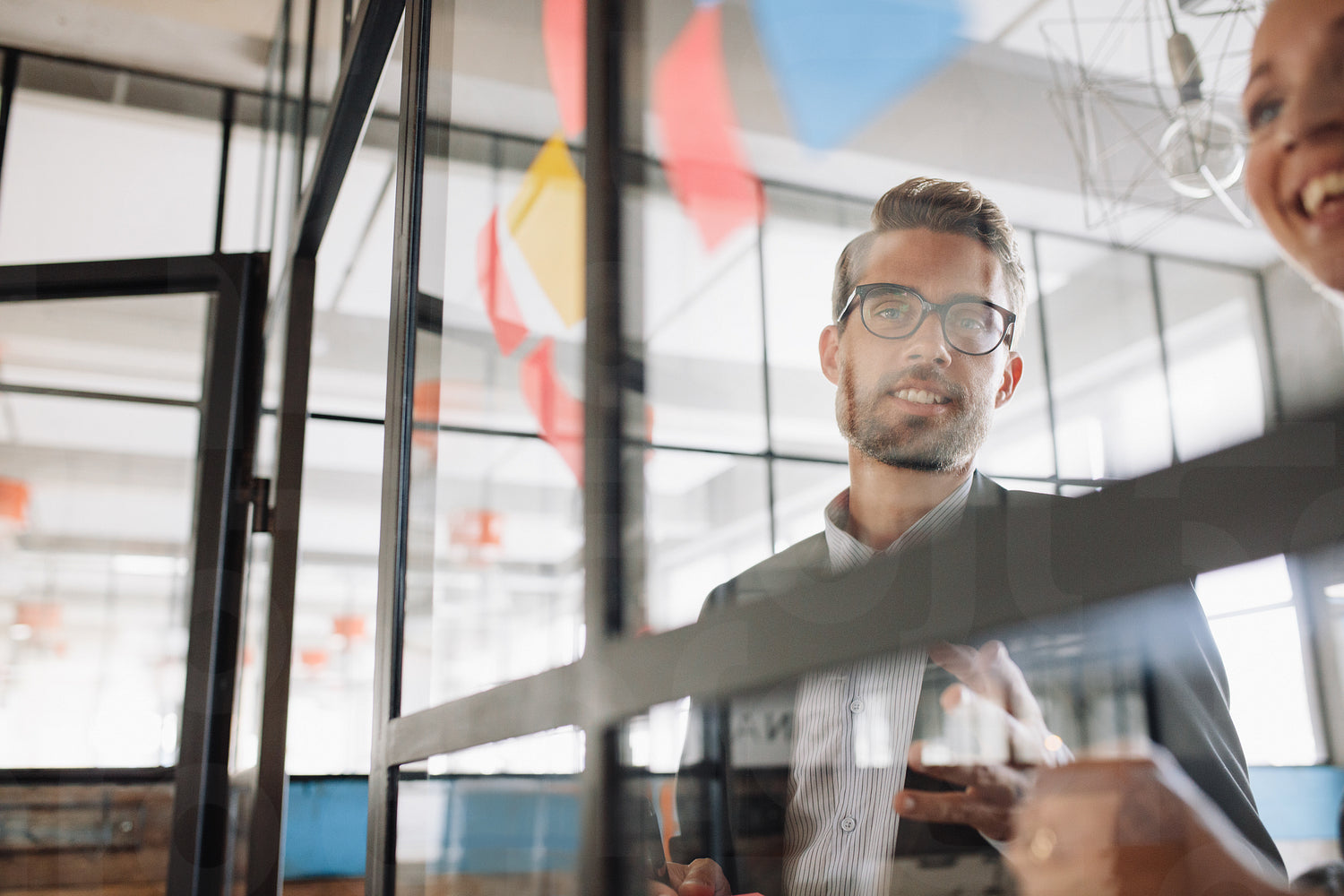 Portrait of young businessman with female colleague looking at adhesive notes on glass wall and brainstorming.