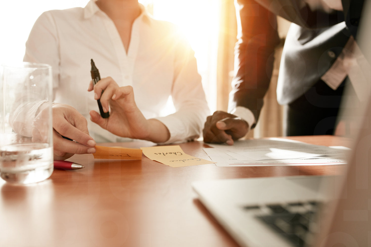 Cropped shot of two businesspeople discussing names written on sticky notes. Business executives doing manpower planning for their new project.