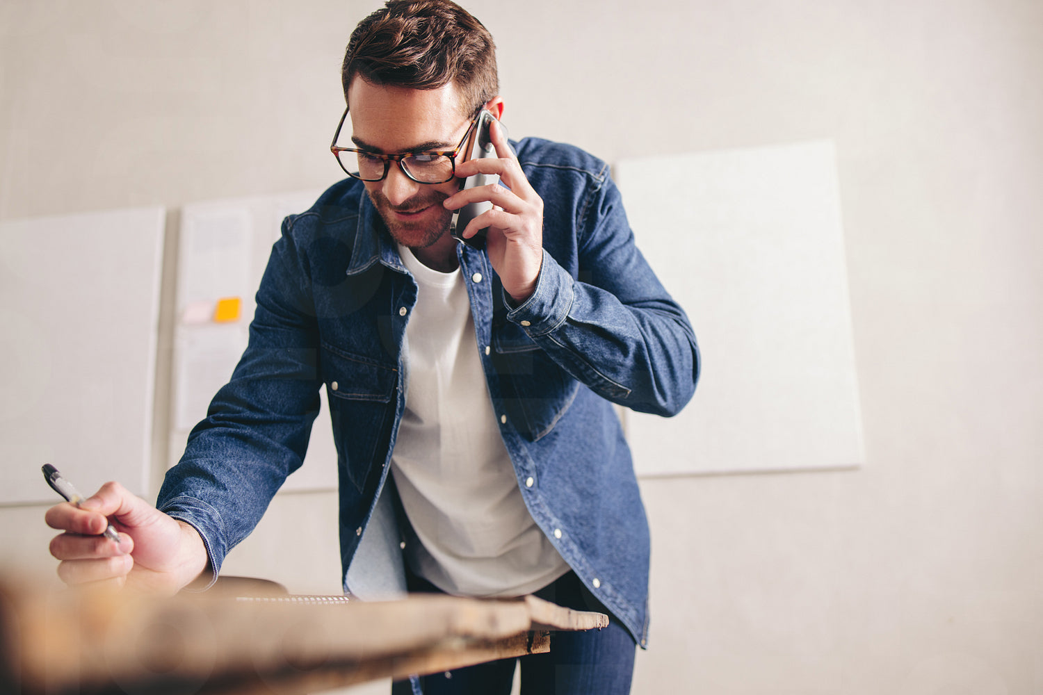 Cheerful businessman writing notes during a phone call in his office. Happy young businessman making plans with his clients over the phone. Creative businessman with glasses working remotely.