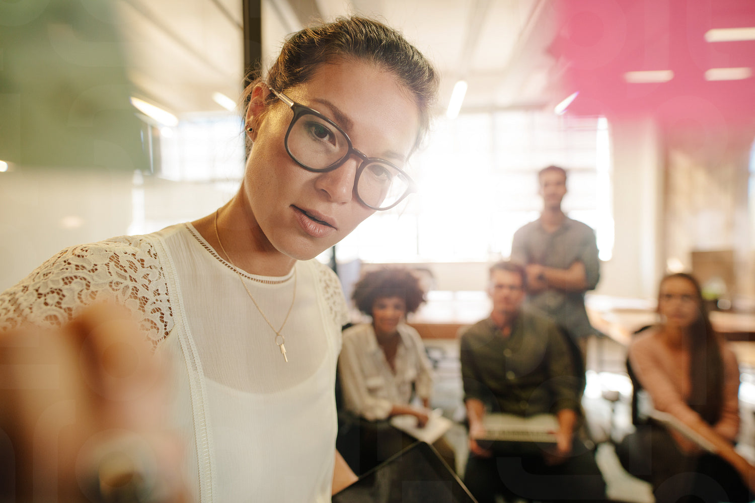 Businesswoman explaining new business ideas to colleagues while looking at sticky notes on glass wall. Female executive discussing business with team sitting in background.