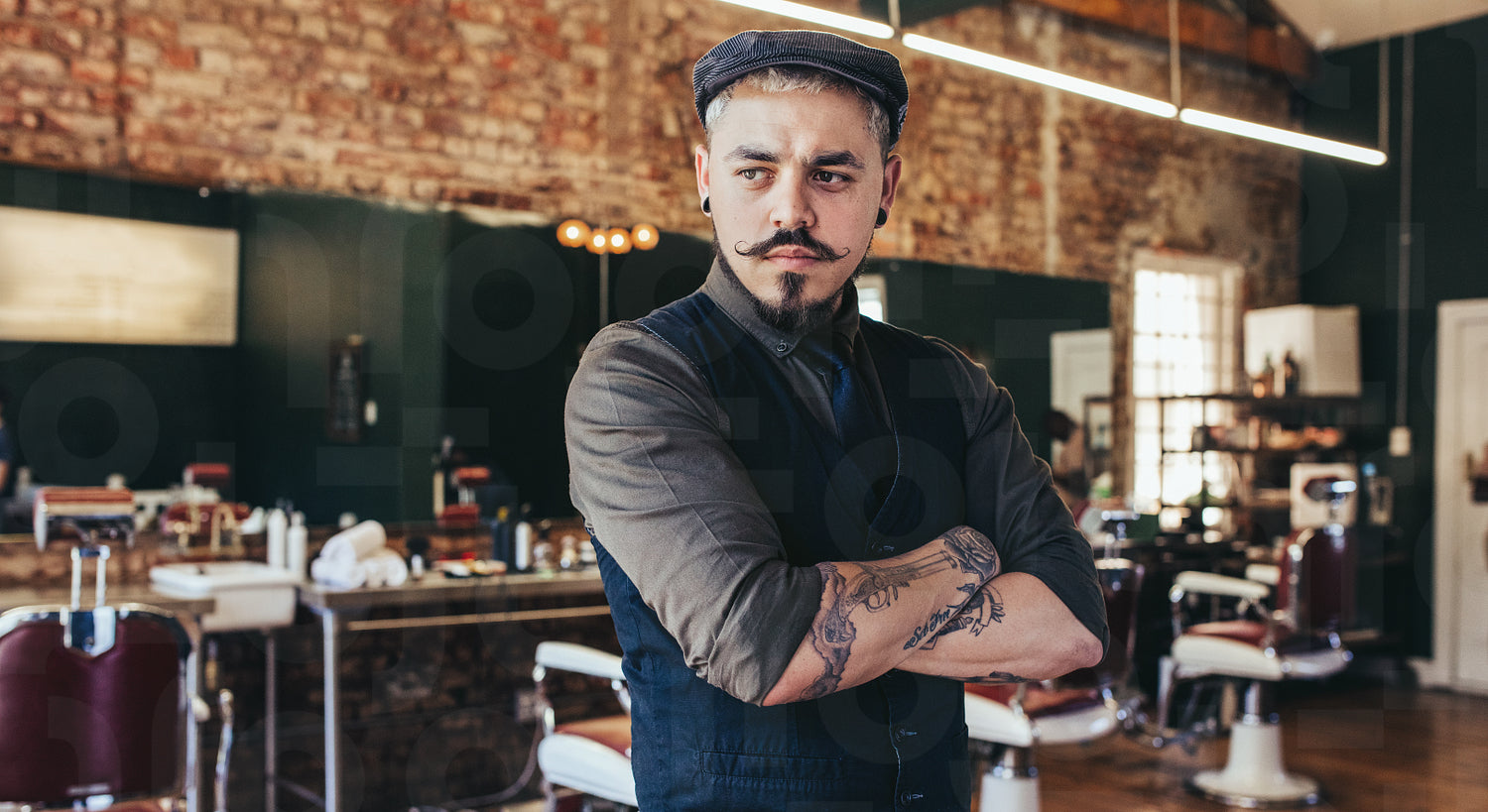 Portrait of stylish male barber looking away with his arms crossed. Male hairdresser standing in his shop.