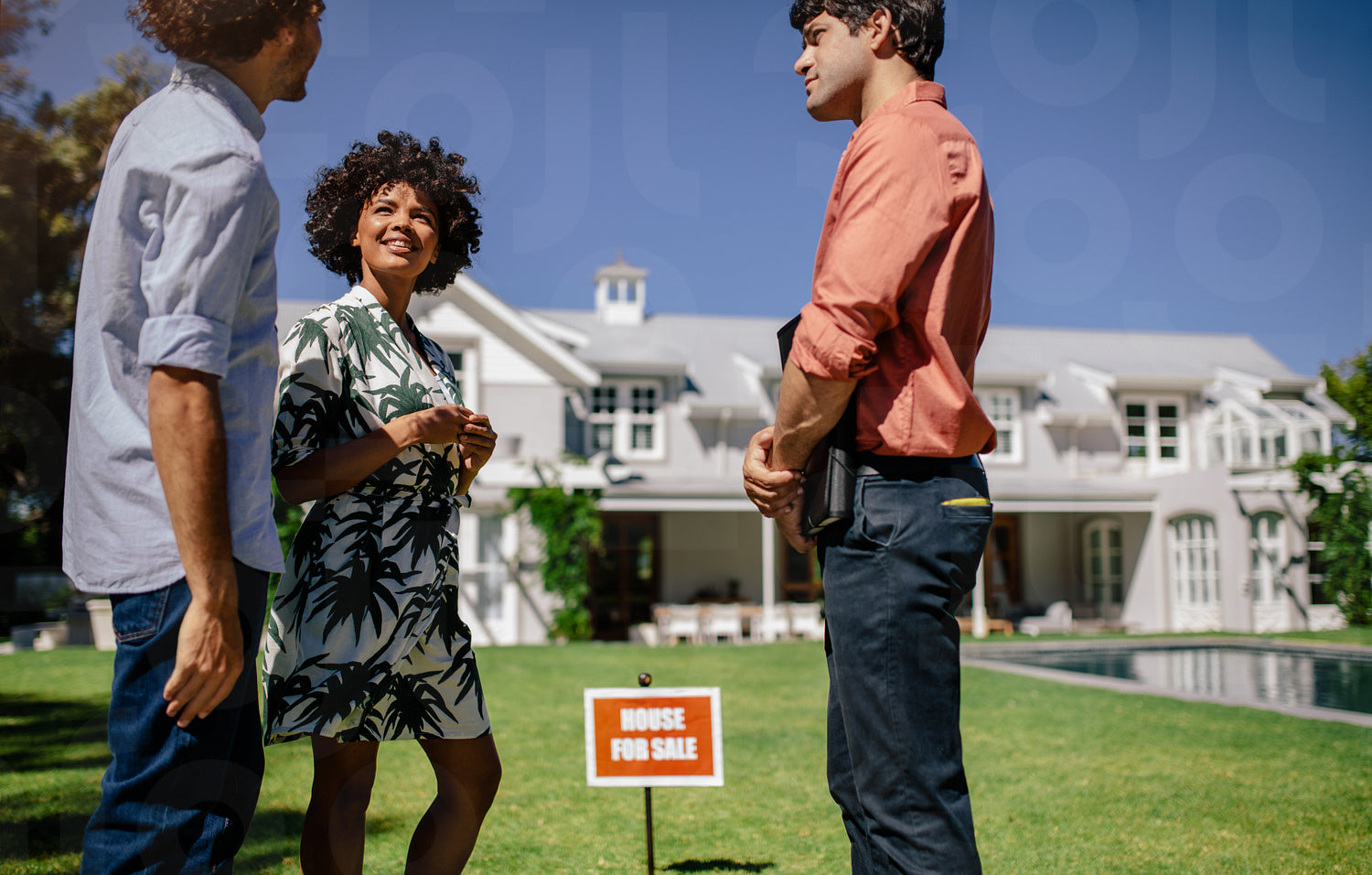 Real estate agent presenting modern house to a young couple. Home buyers with broker standing in lawn of new house for sale.