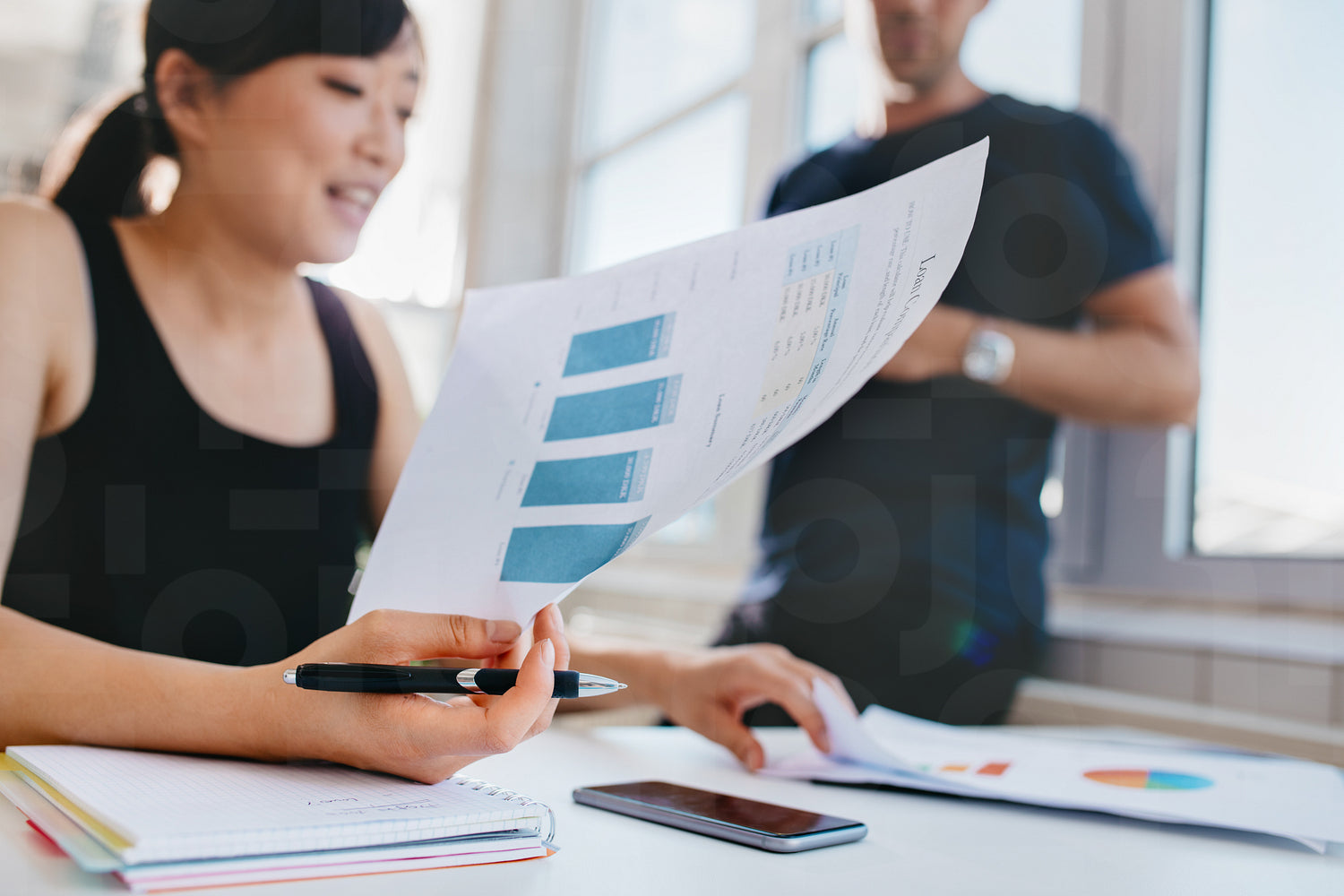 Woman doing financial analysis at office with male colleague standing in background. Asian female holding documents while sitting at her desk.