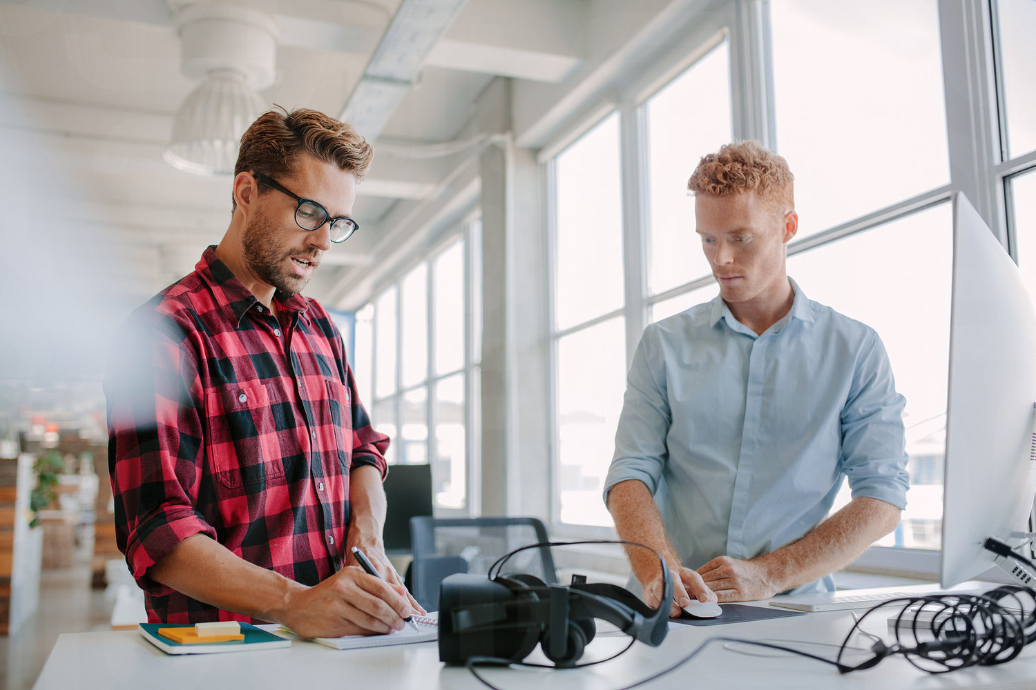 Two young businessman working together. They are standing at a table with virtual reality glasses. One using computer and other writing notes.