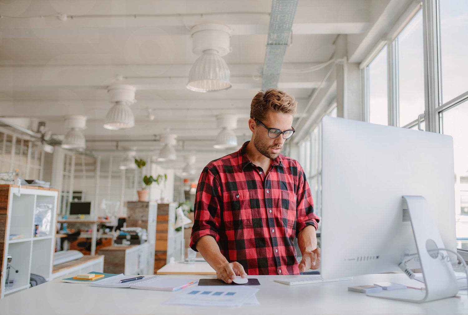 Young man working on computer. Caucasian male office worker using desktop pc in modern office.