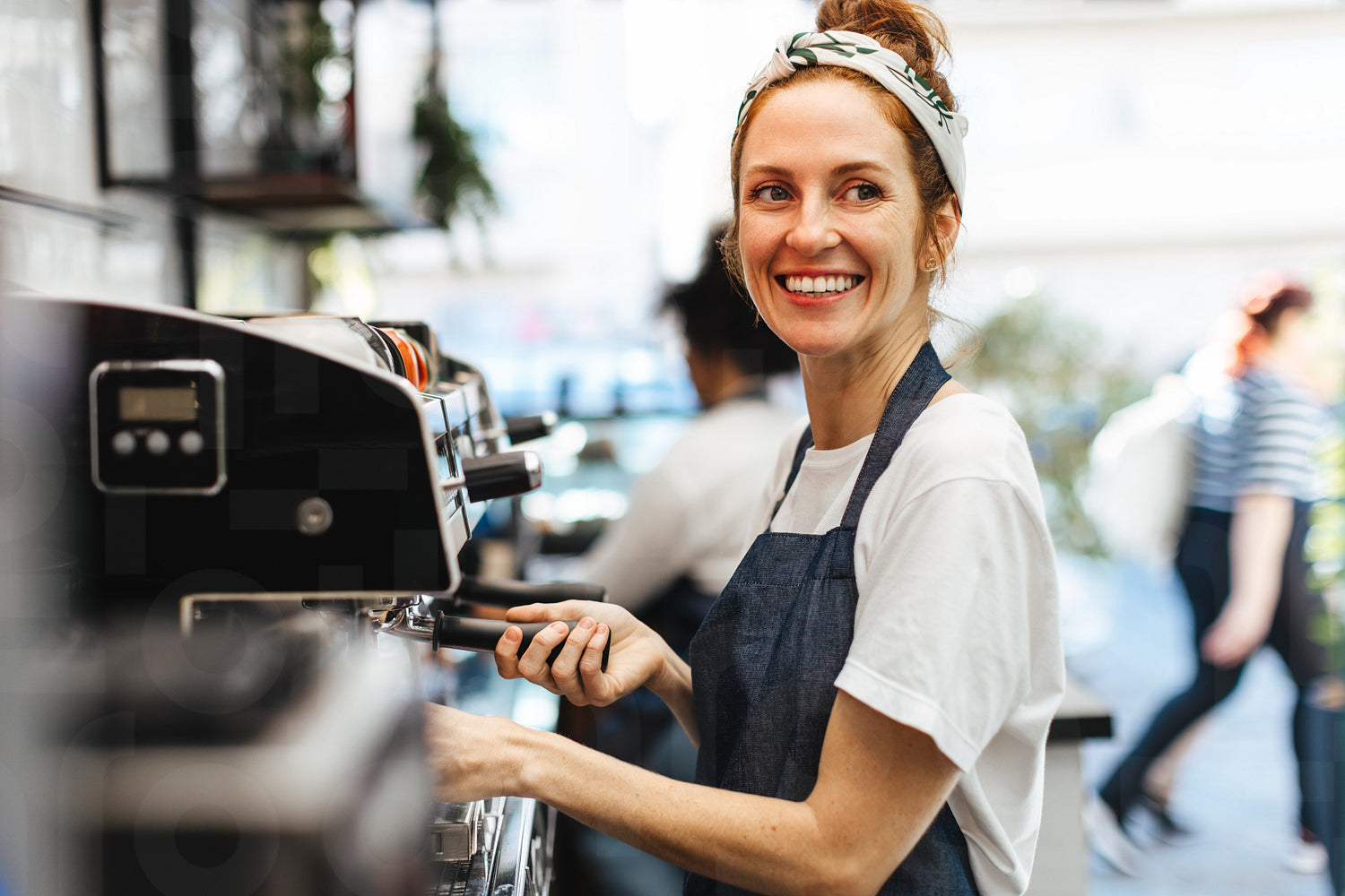 Waitress brewing a fresh cup of coffee for a customer in a cozy coffee shop. Barista smiling as she carefully pours the hot coffee from the coffee machine, ready to provide a delightful dining experience.