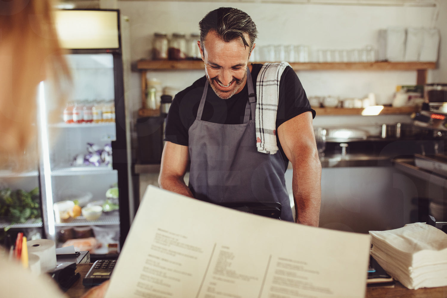 Male barista standing at cafe counter entering customer order on computer. Cafe owner taking order from customer holding a menu card at coffee shop counter.
