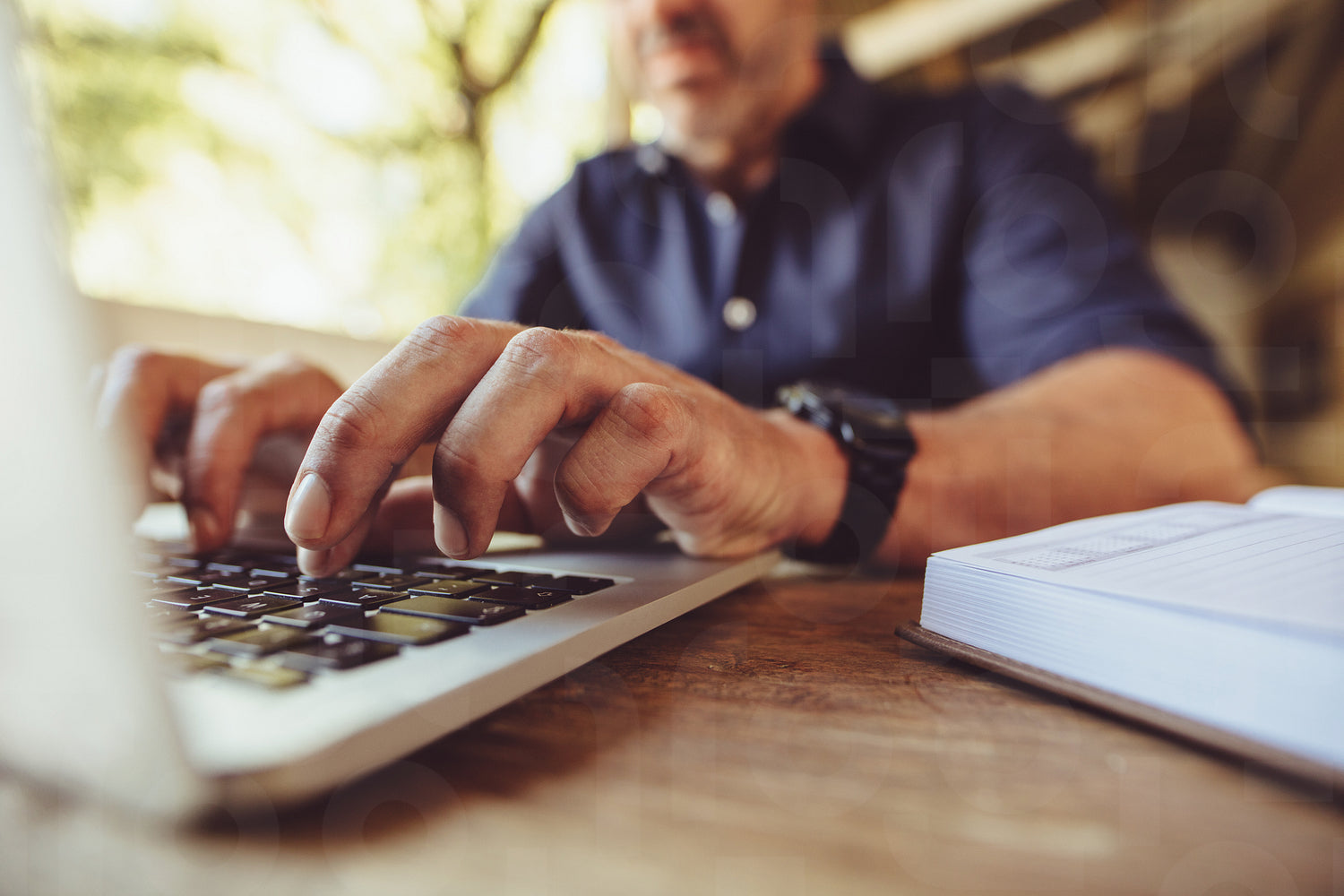 Close-up of man tying on his laptop on coffee shop table. Man doing his work sitting at a coffee shop.