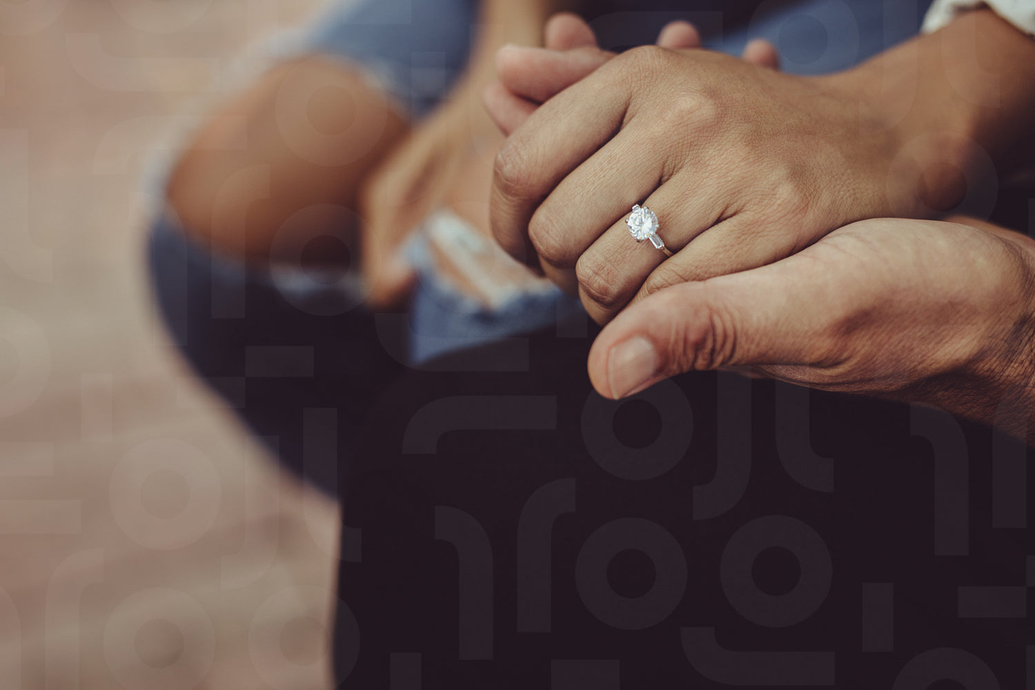 Close-up of a woman with engagement ring holding hand of her husband. Married couple sitting together holding hands.