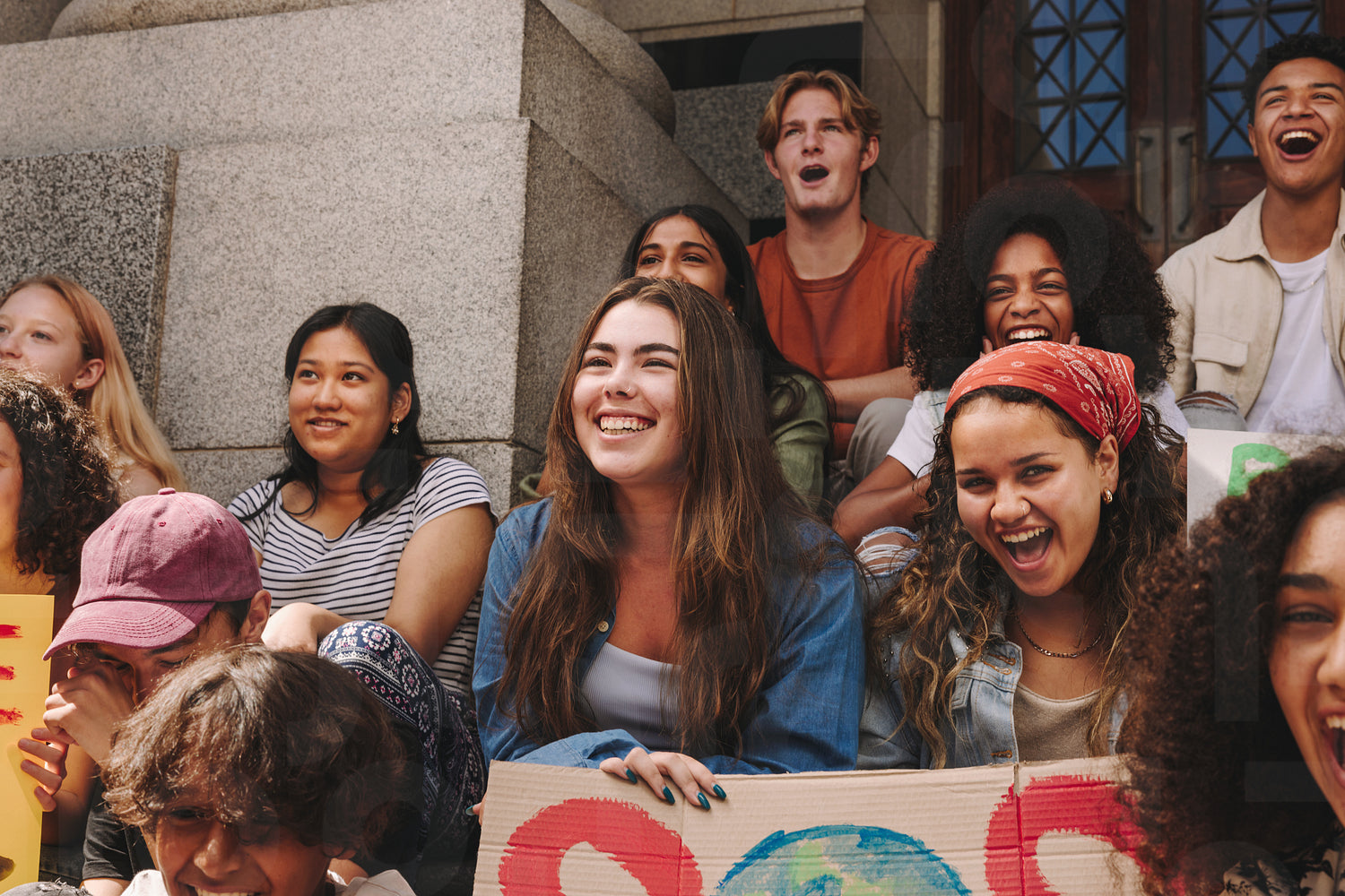Group of youth activists smiling happily while sitting outside a building with posters and banners. Multicultural young people protesting against global warming and climate change.