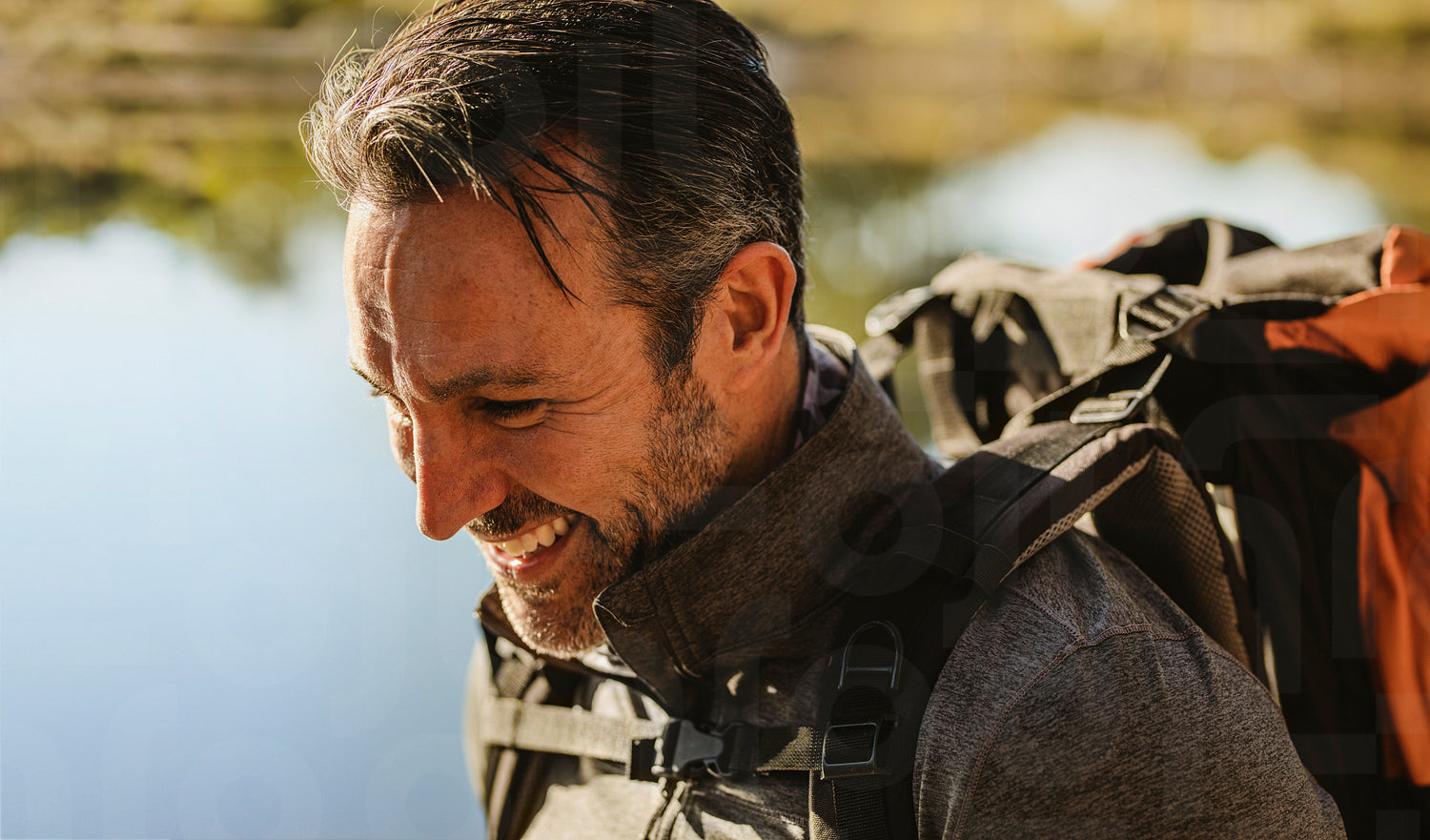 Closeup of a mature man with backpack smiling. Male camper standing by the lake.