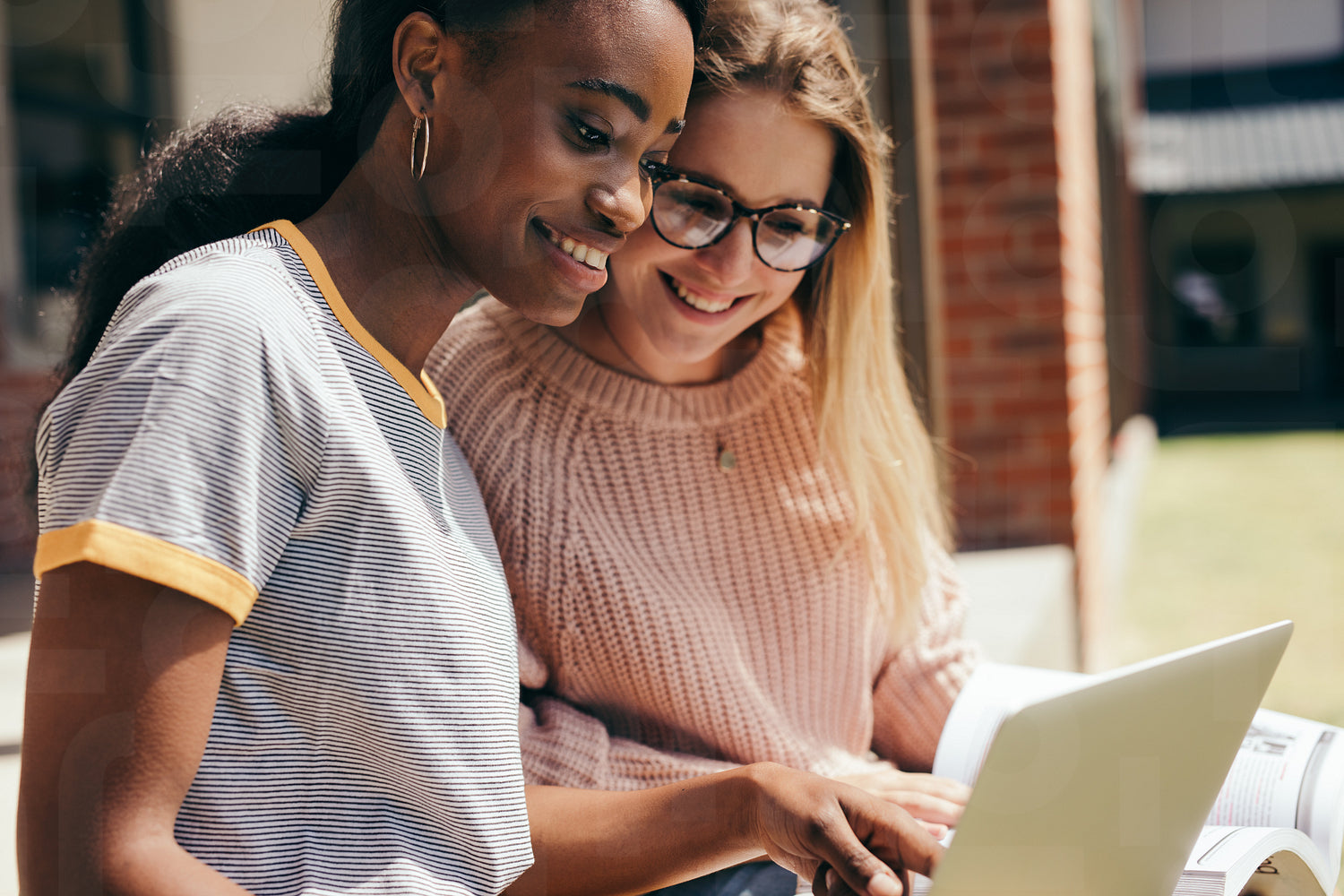 Two young people finding information for their study on laptop at college campus. Young students sitting at university campus working on laptop computer.