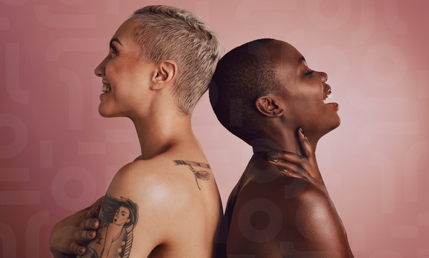 Side view of two diverse women models standing back to back. Two women standing together and smiling over beige background.