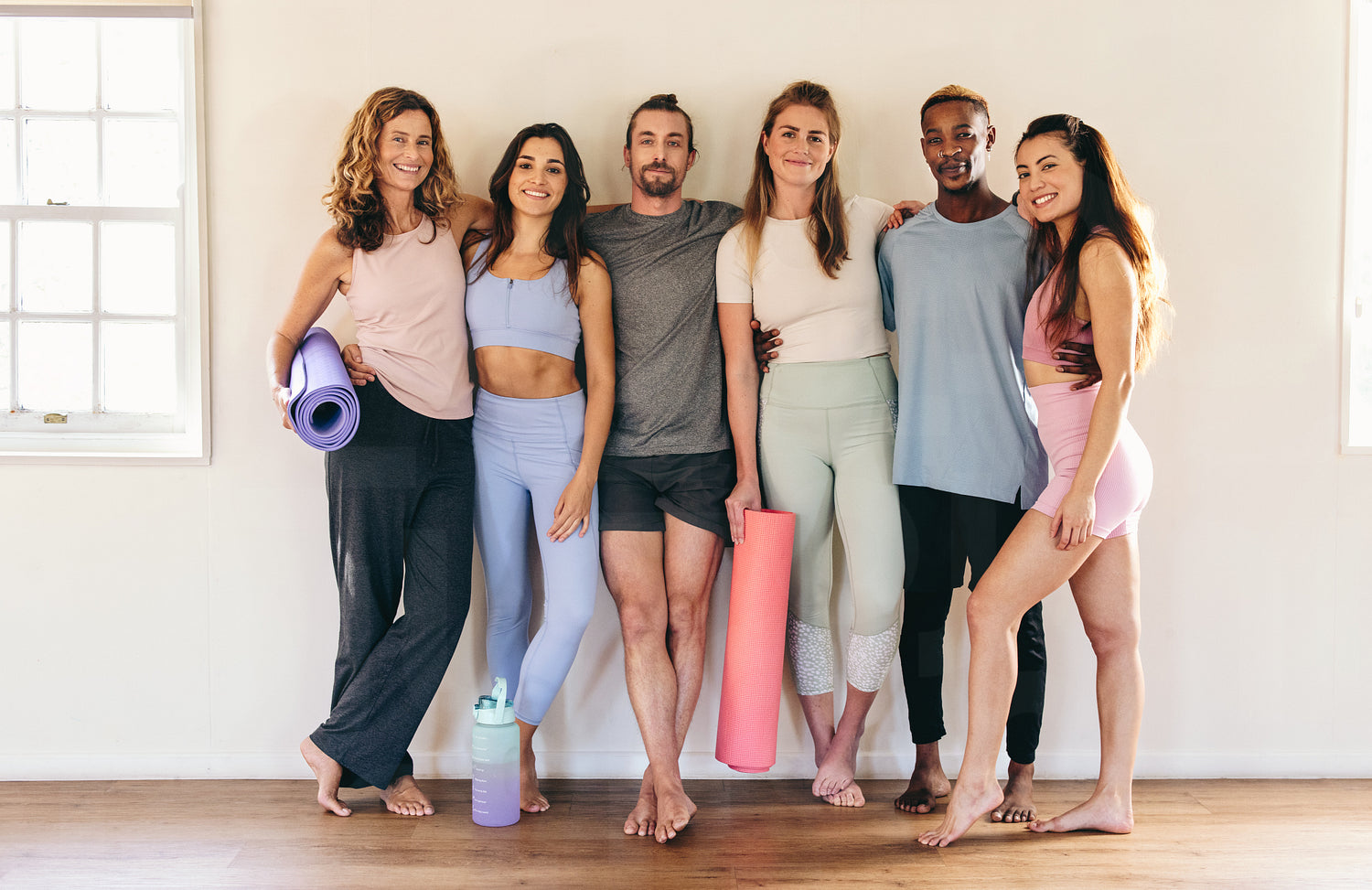 Portrait of fitness friends embracing each other while standing in a yoga studio. Group of diverse people attending a yoga class together. Happy people working out in a community fitness studio.