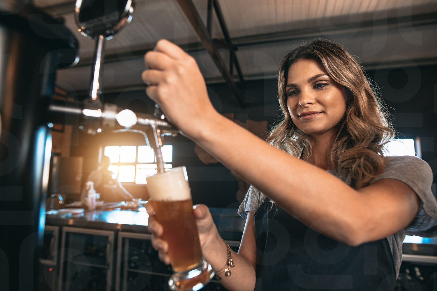 Young woman dispensing beer in a bar from metal spigots. Beautiful female bartender tapping beer in bar.