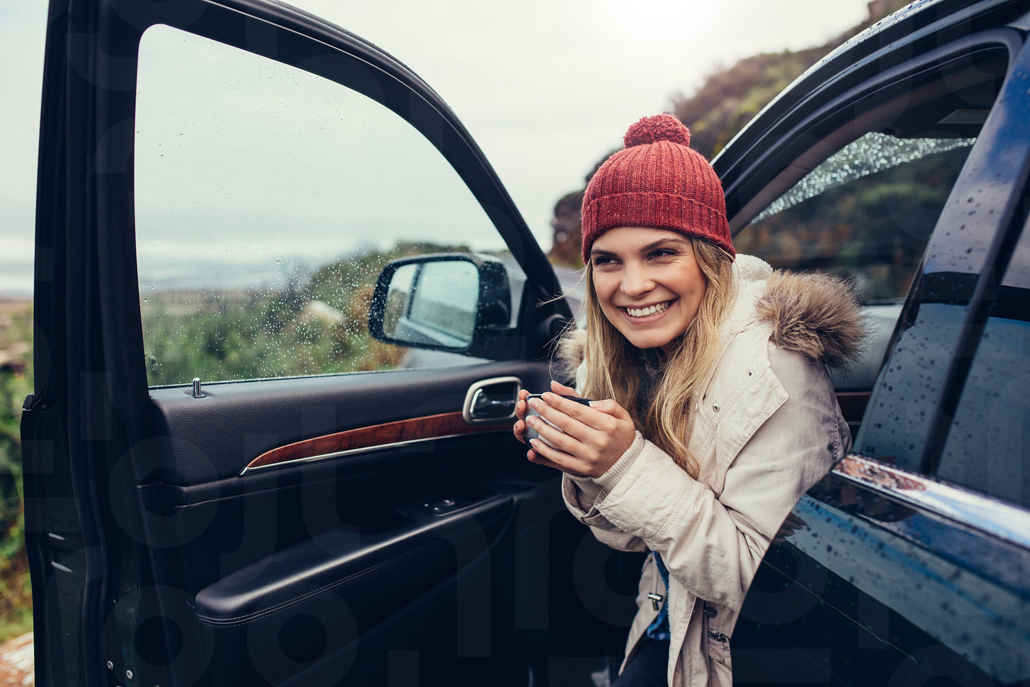 Beautiful smiling woman in her car drinking coffee. Happy young female holding cup of coffee and looking away while sitting in her car.