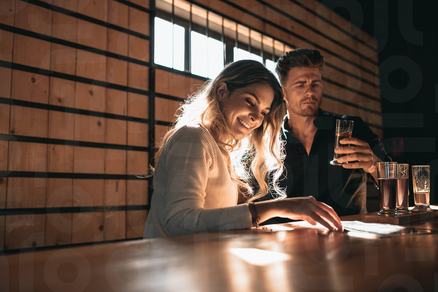 Young couple at the bar tasting different varieties of craft beers. Beautiful young woman with her boyfriend at the bar having beers.