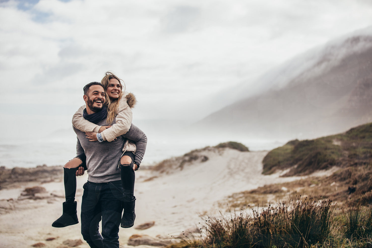 Man carrying girlfriend on his back at winter beach. Young couple enjoying holidays at the seashore.