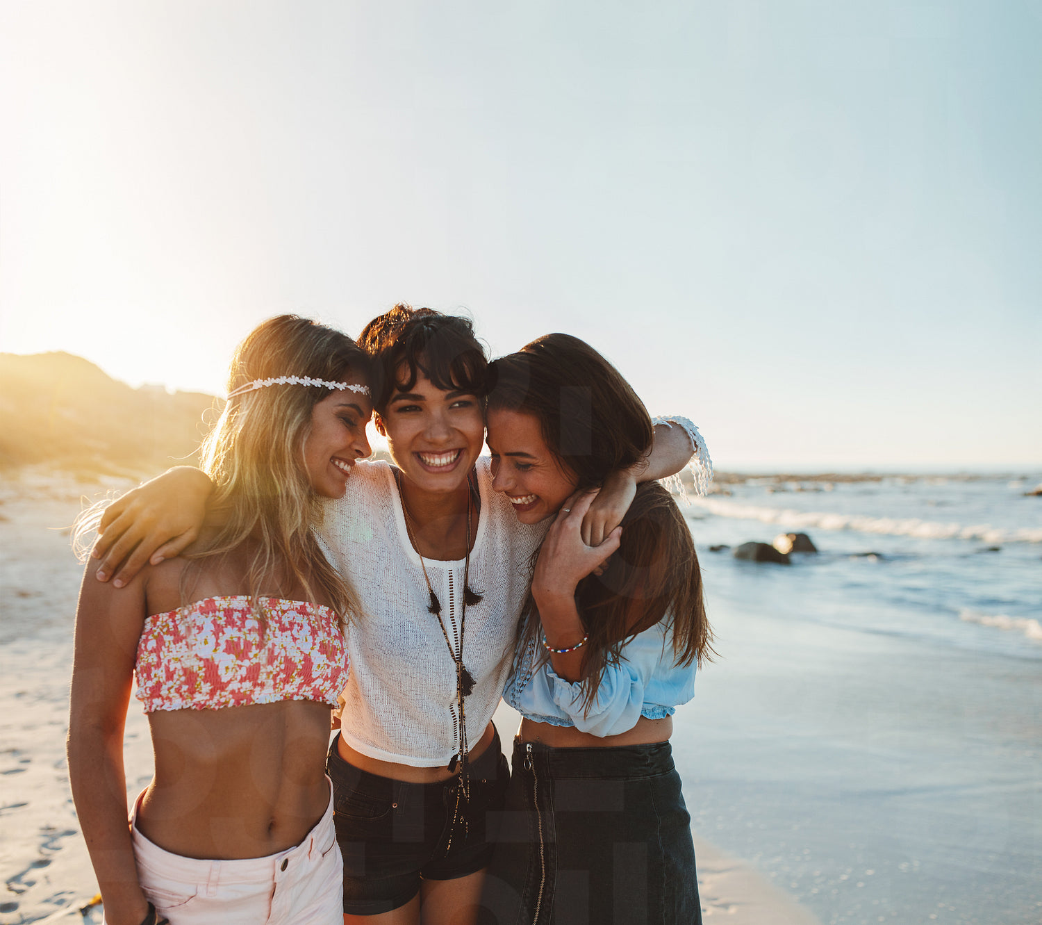 Female friends walking together at the beach