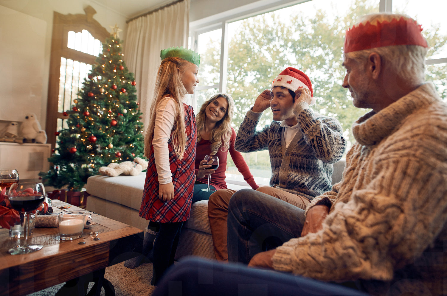Happy family at home wearing santa hat and crown on christmas eve. Little girl with her parents and grandparents celebrating christmas.