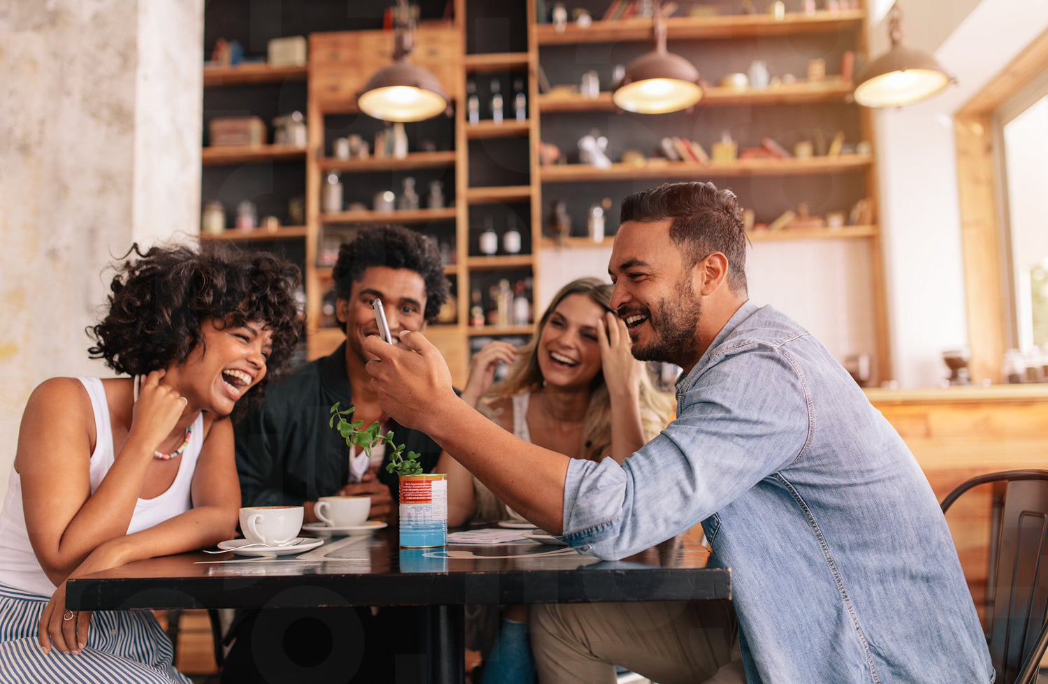 Young group of friends sitting in a cafe and using mobile phone. Young man and women sitting at cafe table and laughing.