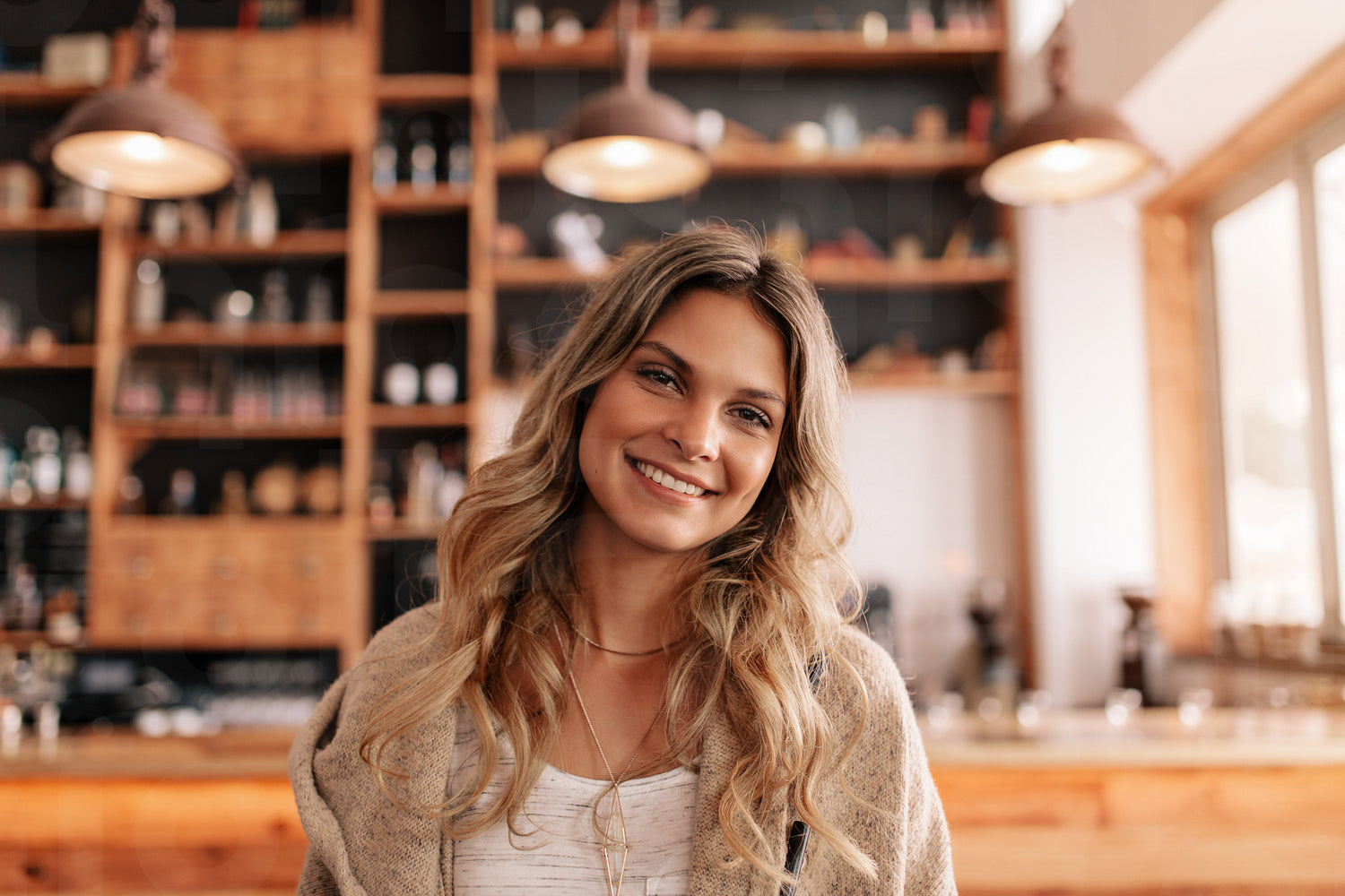 Portrait of beautiful young woman standing in a coffee shop. Young caucasian female in a cafe looking at camera and smiling.