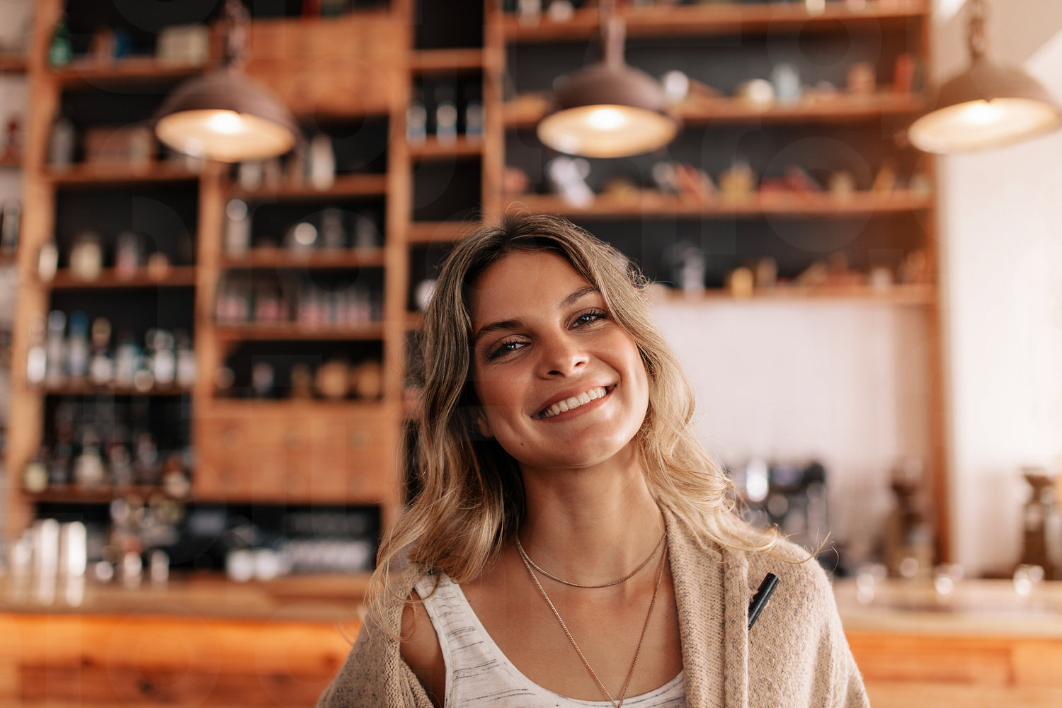 Portrait of beautiful young caucasian woman standing in a cafe looking at camera and smiling. Young female in a coffee shop with a beautiful smile on her face.