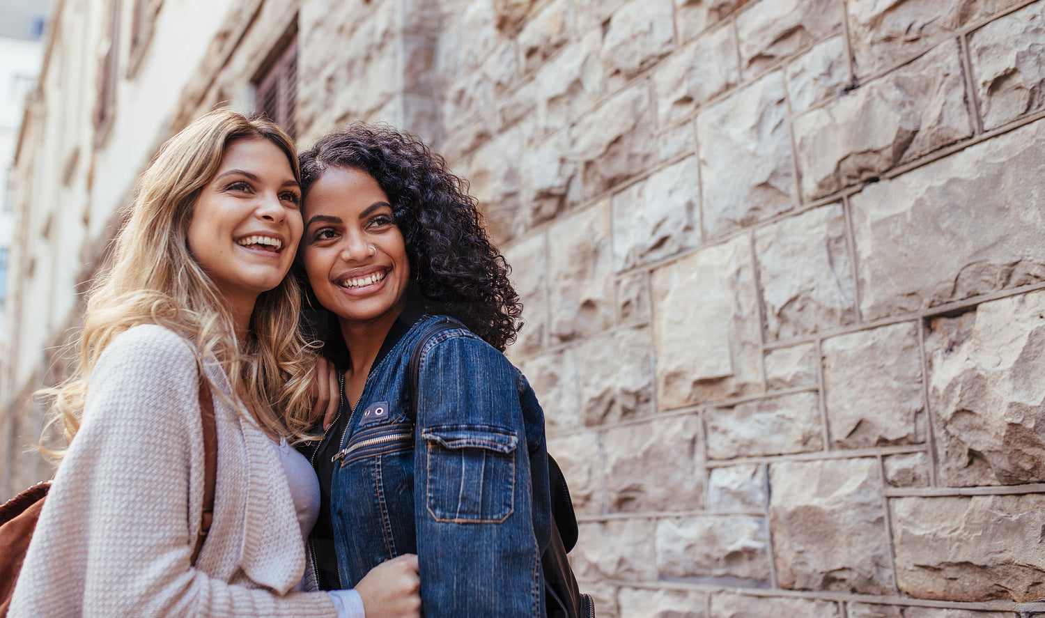 Young women standing together beside a stone wall. Two smiling women posing for a photograph outdoors.