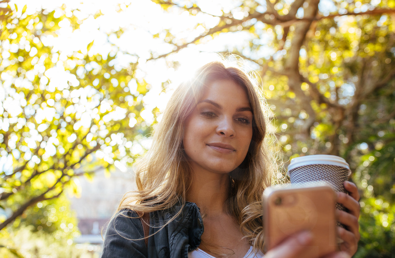 Woman looking at her mobile phone while holding a coffee glass. Woman enjoying coffee in park while taking a selfie using mobile phone.
