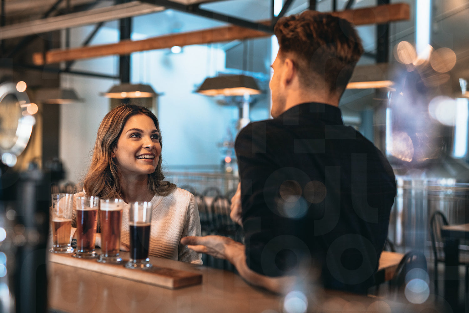 Young couple at bar with different craft beers on a wooden table. Man and woman talking at the bar counter.
