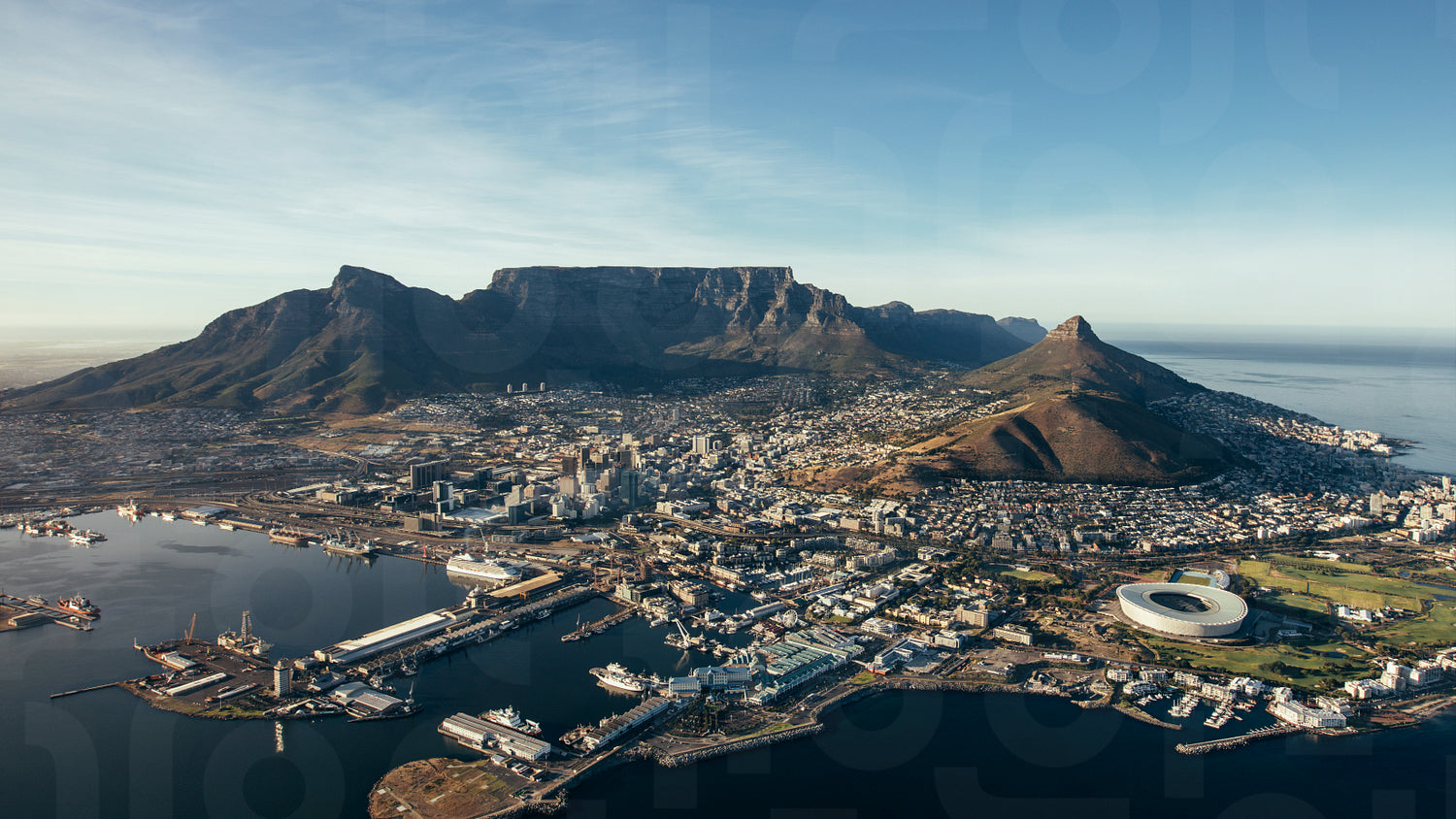 Aerial coastal view of cape town city with table mountain, cape town harbour, lions head and devils peak, South africa.