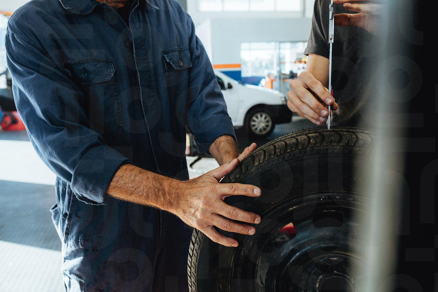 Two technicians checking the depth of tire tread with measuring instrument. Mechanics inspecting the tire in workshop. Closeup shot with focus on hands of mechanics.