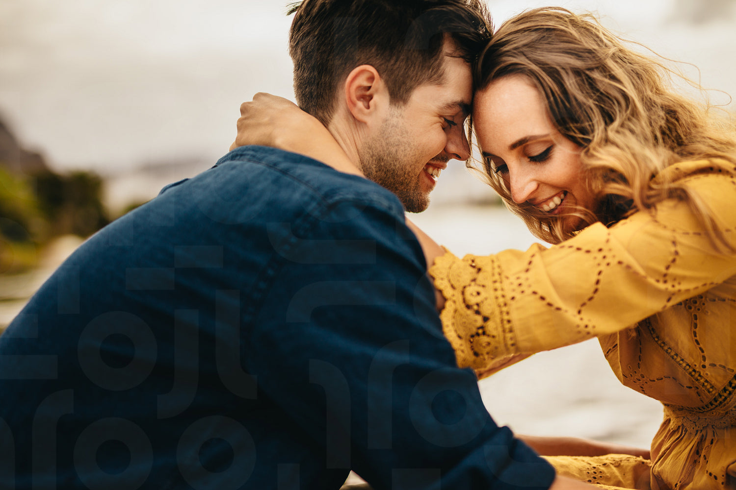 Side view of a young couple sitting together touching their heads. Romantic couple on a date sitting near a lake holding each other.