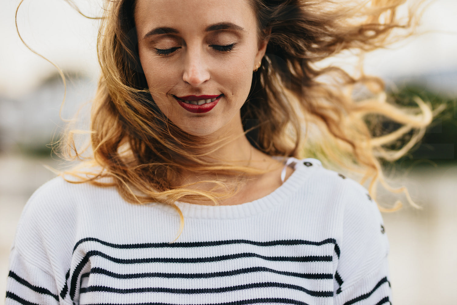 Close up of a young woman standing outdoors with her hair flying. Portrait of a woman with a pleasant smile standing outdoors.