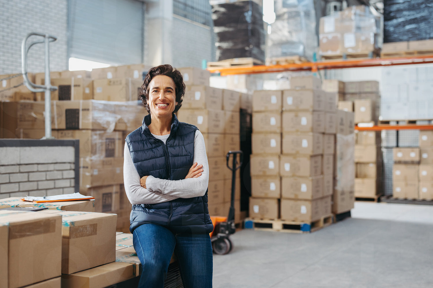 Mature warehouse supervisor smiling at the camera while sitting on a rack of cardboard boxes with her arms crossed. Happy woman working in a large distribution centre.