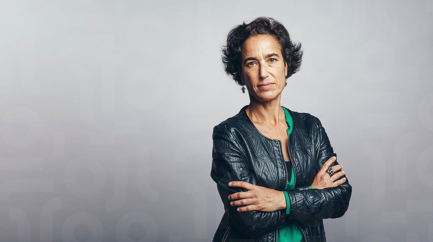 Woman with short hair standing against grey background looking at camera. Woman in jacket standing with her arms crossed.