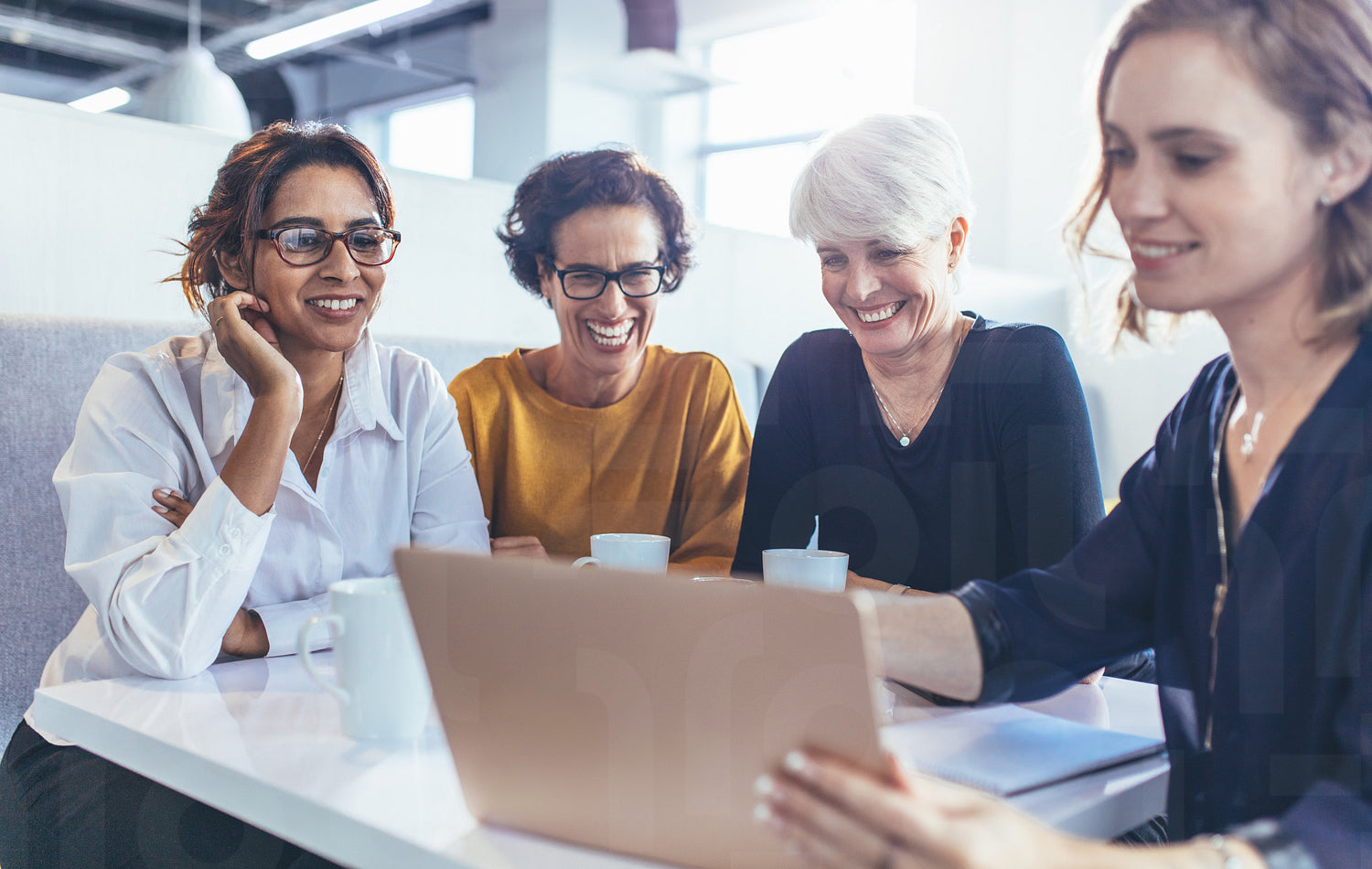 Team of female professionals in cafeteria with a laptop