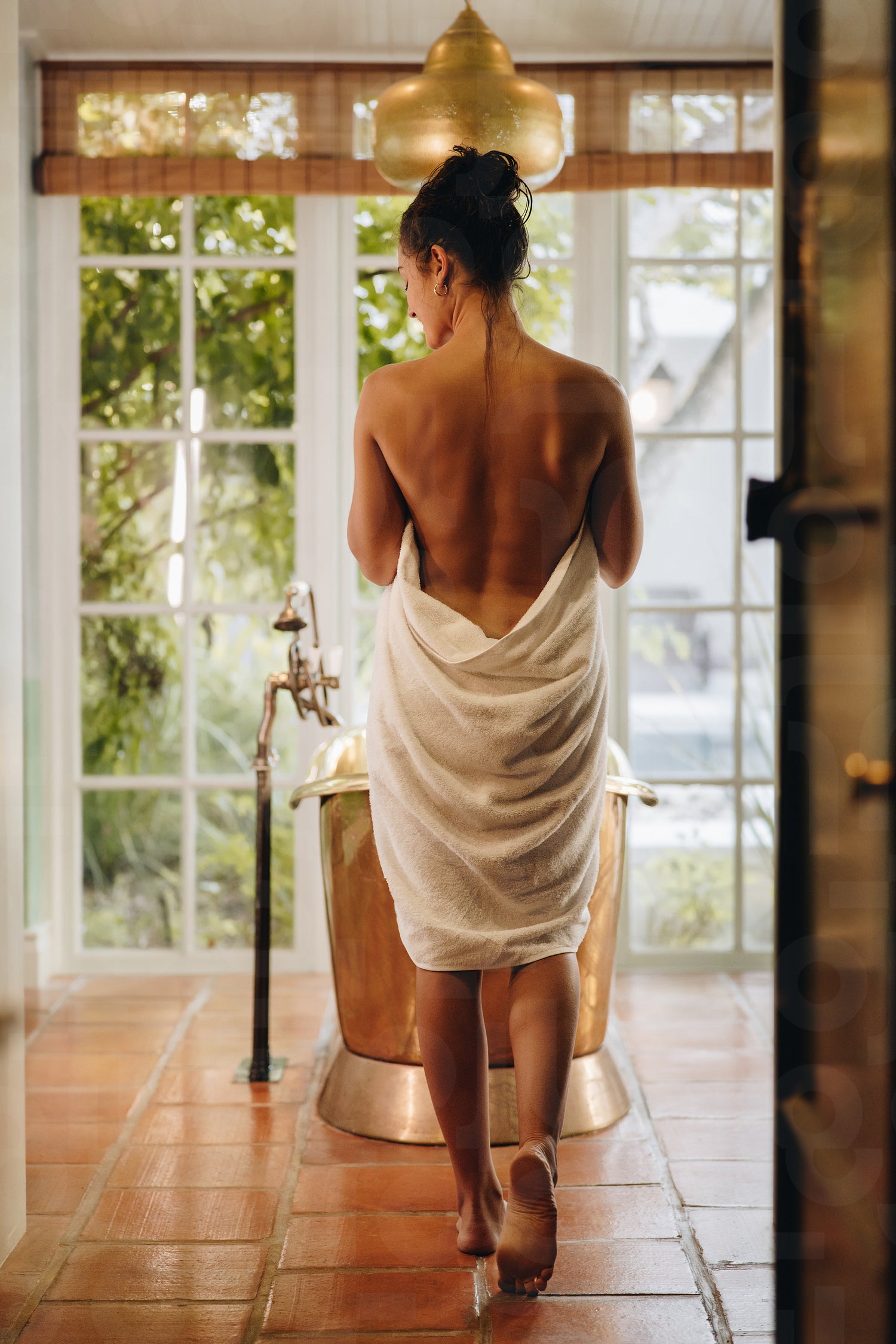 Back view of an attractive young woman removing her towel for a bath. Glamorous young woman walking towards a bathtub in her hotel room. Young woman enjoying a weekend getaway at a luxury hotel.