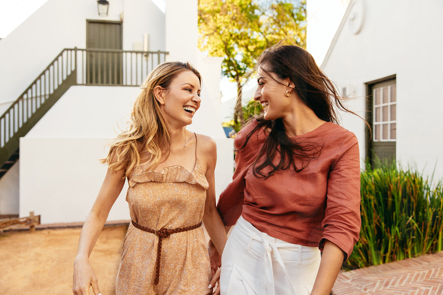 Best friends laughing while walking together outside a holiday resort. Two happy young woman enjoying their summer vacation together. Female friends having fun while spending time together.