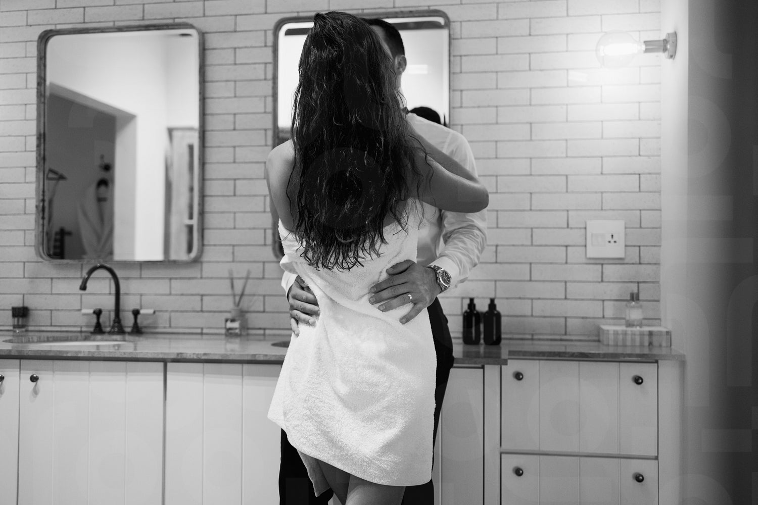 Black and white shot of a couple getting dressed together. Young woman fixing her husband’s bow tie while wearing a white towel. Romantic young couple getting ready for a dinner at a luxury hotel.