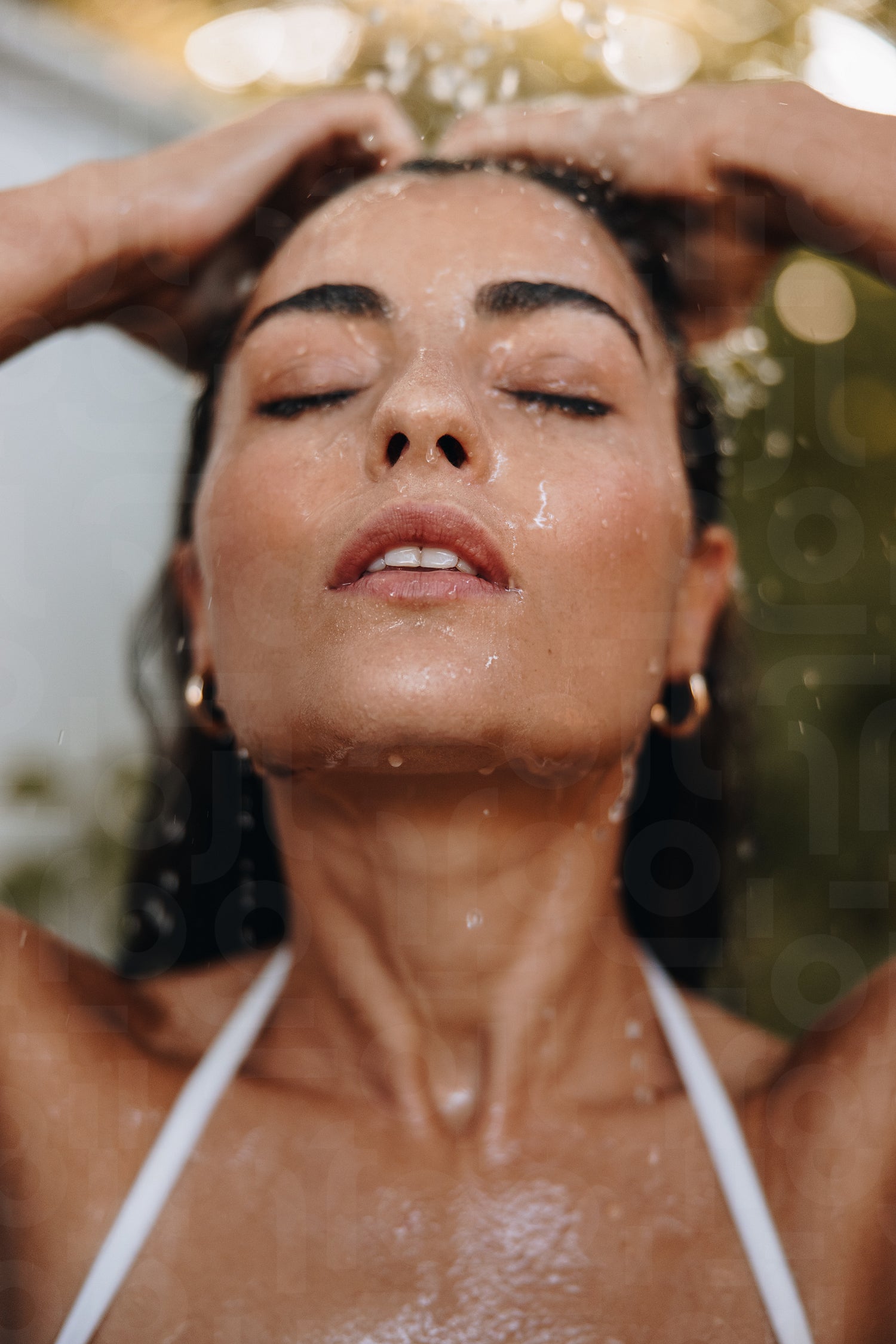 Closeup of a woman showering outdoors