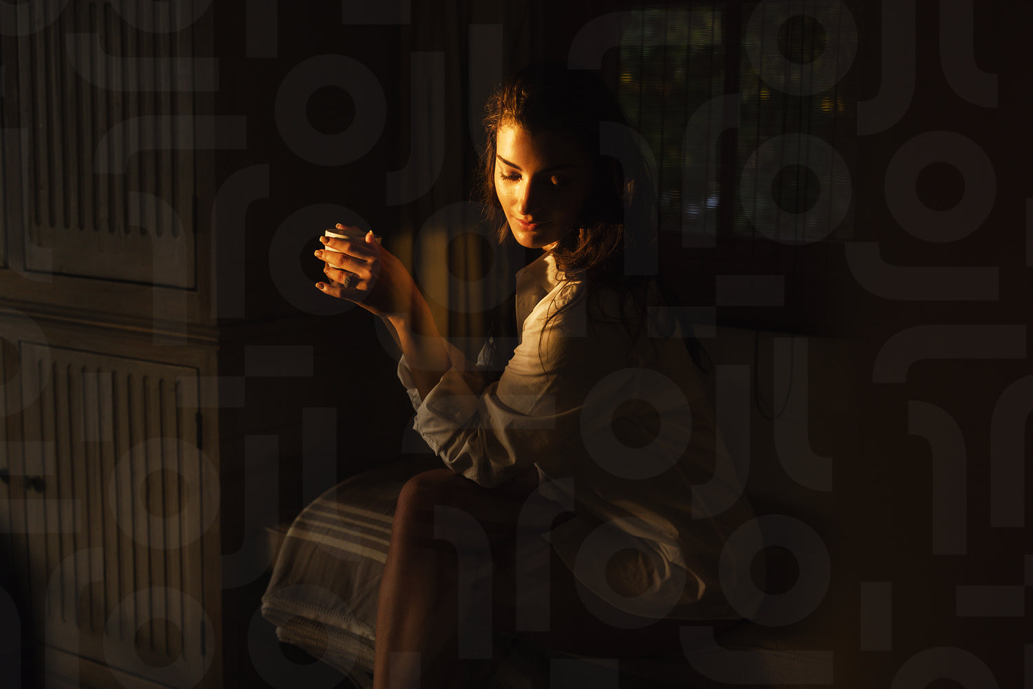 Female tourist relaxing in a luxury hotel room. Attractive young woman having a cup of coffee while sitting on a chair. Young tourist woman enjoying her summer vacation in a luxury hotel.