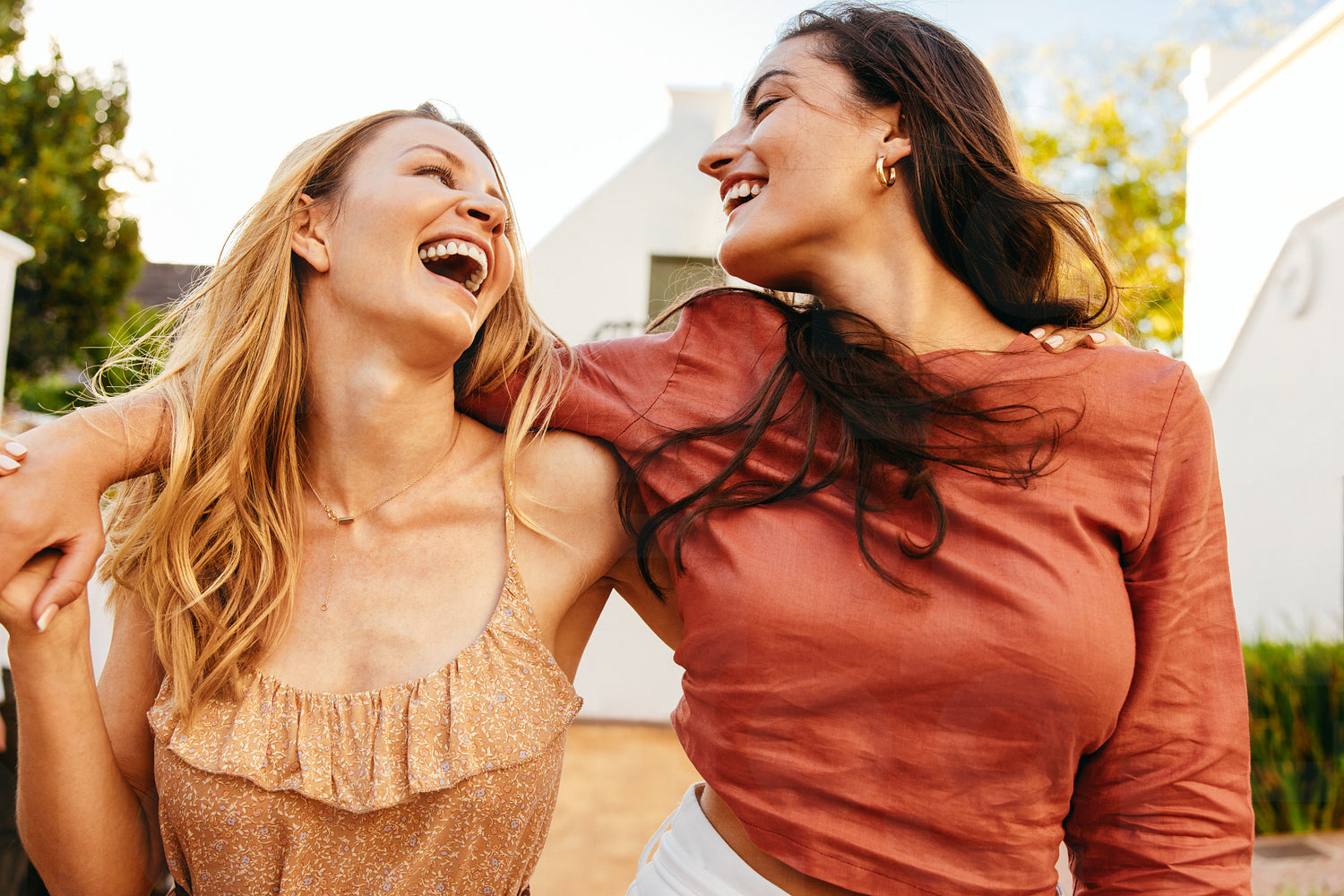 Friends laughing cheerfully while embracing each other outdoors. Two happy young women walking together outside a holiday resort. Best friends having fun during their summer vacation.