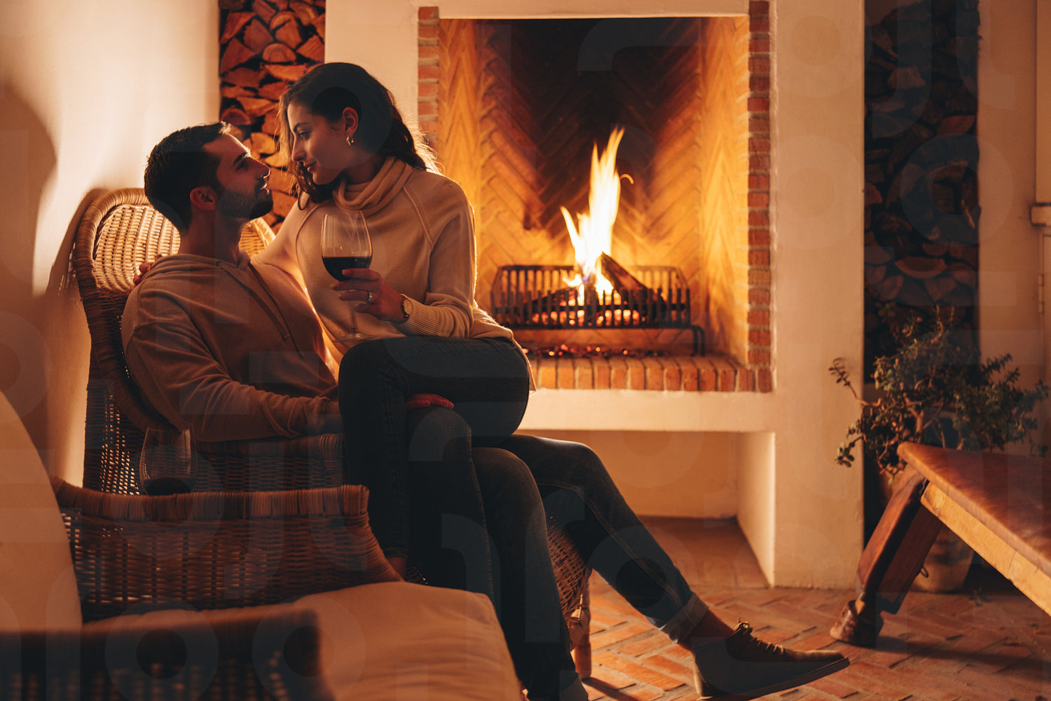 Honeymooners relaxing in front of a fireplace in a hotel