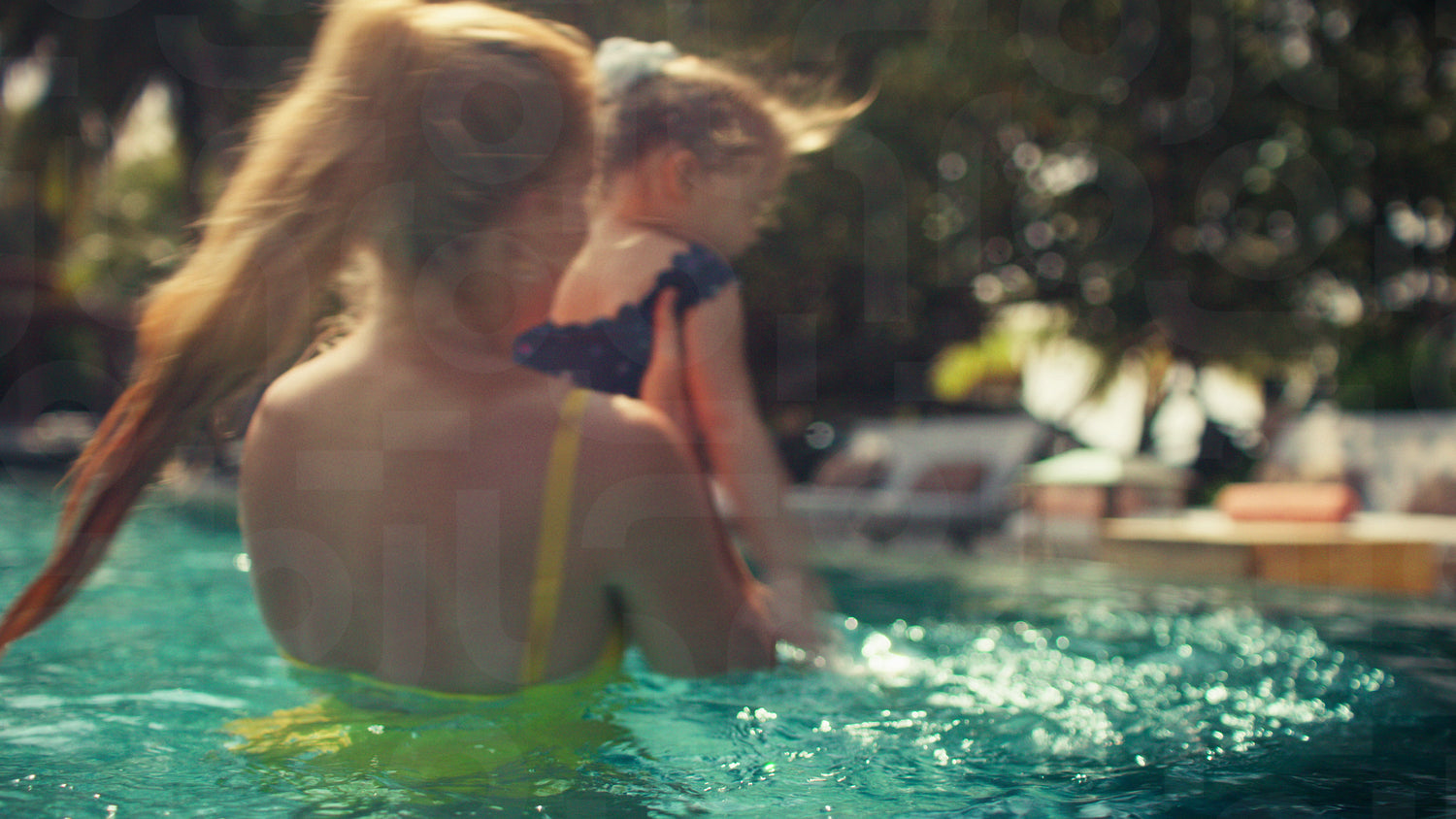 A loving mother and her adorable daughter share a joyful moment, laughing and splashing together in a beautiful swimming pool. Family fun, summer vacations, and precious bonding time.