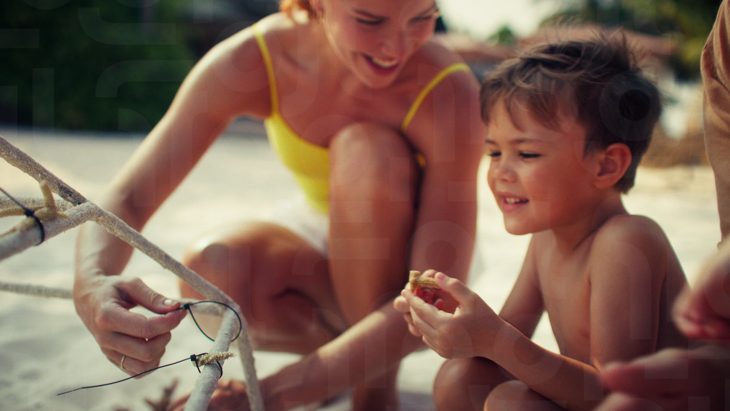 Mother and son happily learning about coral reef conservation on a beautiful sandy beach