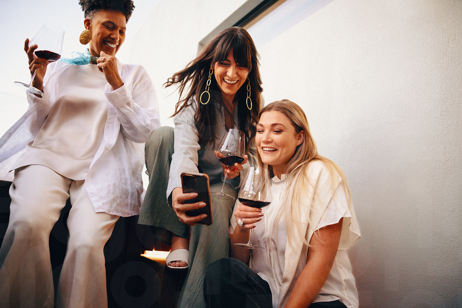 Three women seated outdoors share a joyous moment, drinking red wine and using a smartphone. The scene radiates fun and warmth, showcasing friendship and relaxation during a pleasant evening together.