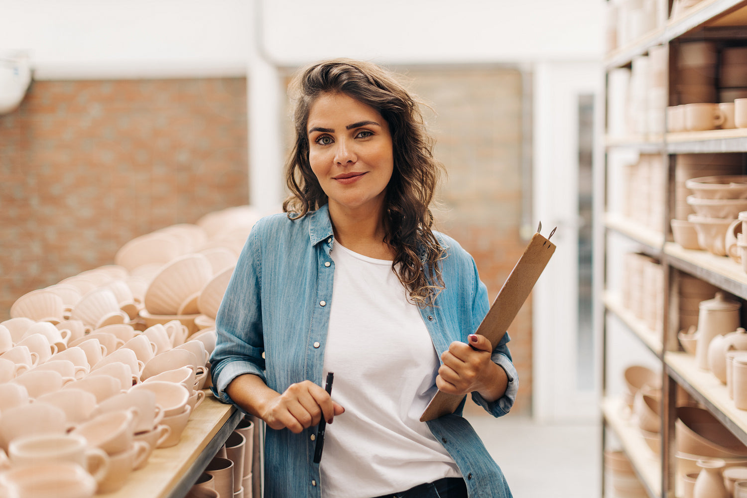 Confident businesswoman looking at the camera in her ceramic store. Creative entrepreneur managing a shop with handmade earthenware products. Female ceramist running a successful small business.